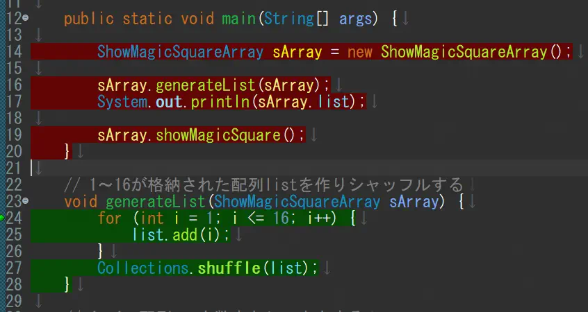 上の画像で言うと、mainメソッドをまだ実行していなかったので、赤のままになっていたということになります。
