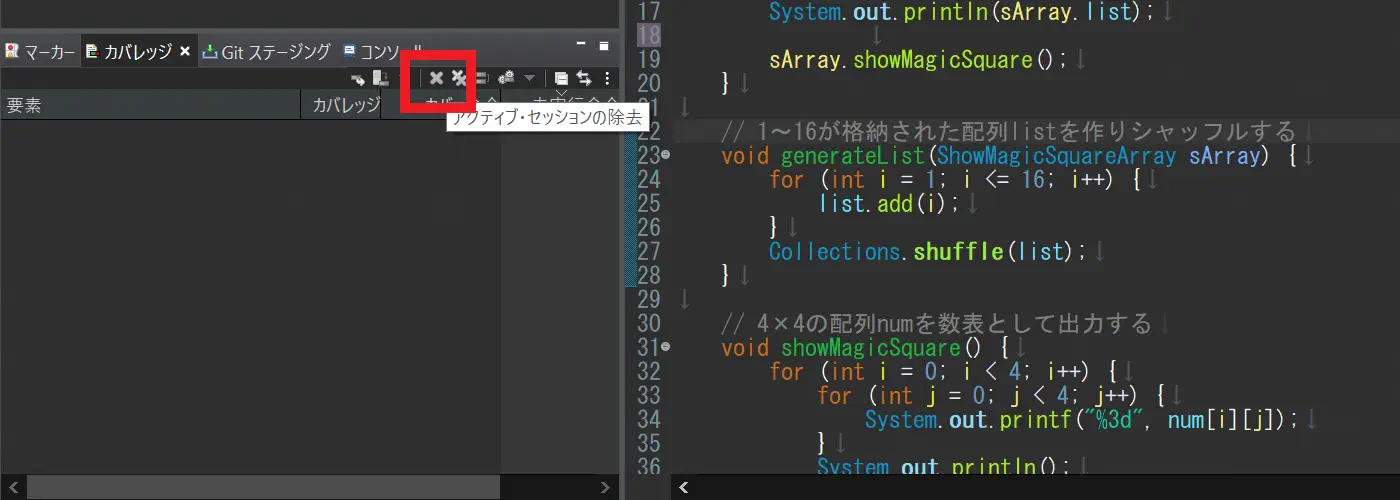 解消方法は「カバレッジ」のタブを開き、「セッションの除去(バツマークのアイコン)」をクリックしたら消えました。小さいので見え辛いですが、以下の画像だと左下の赤枠で囲ったところにバツマークがあります。