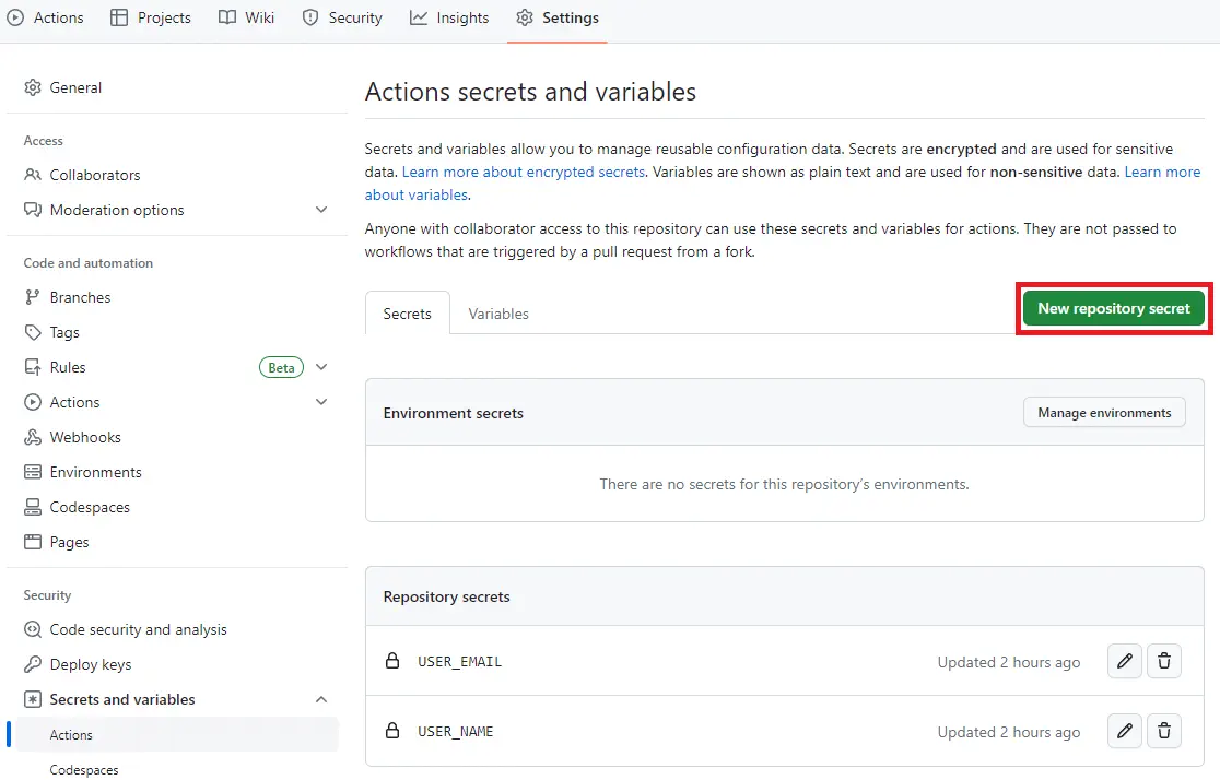 リポジトリの「Settingsタブ」→「Secrets and variables」→「Actions」→「New repository secret」から環境変数を設定します。