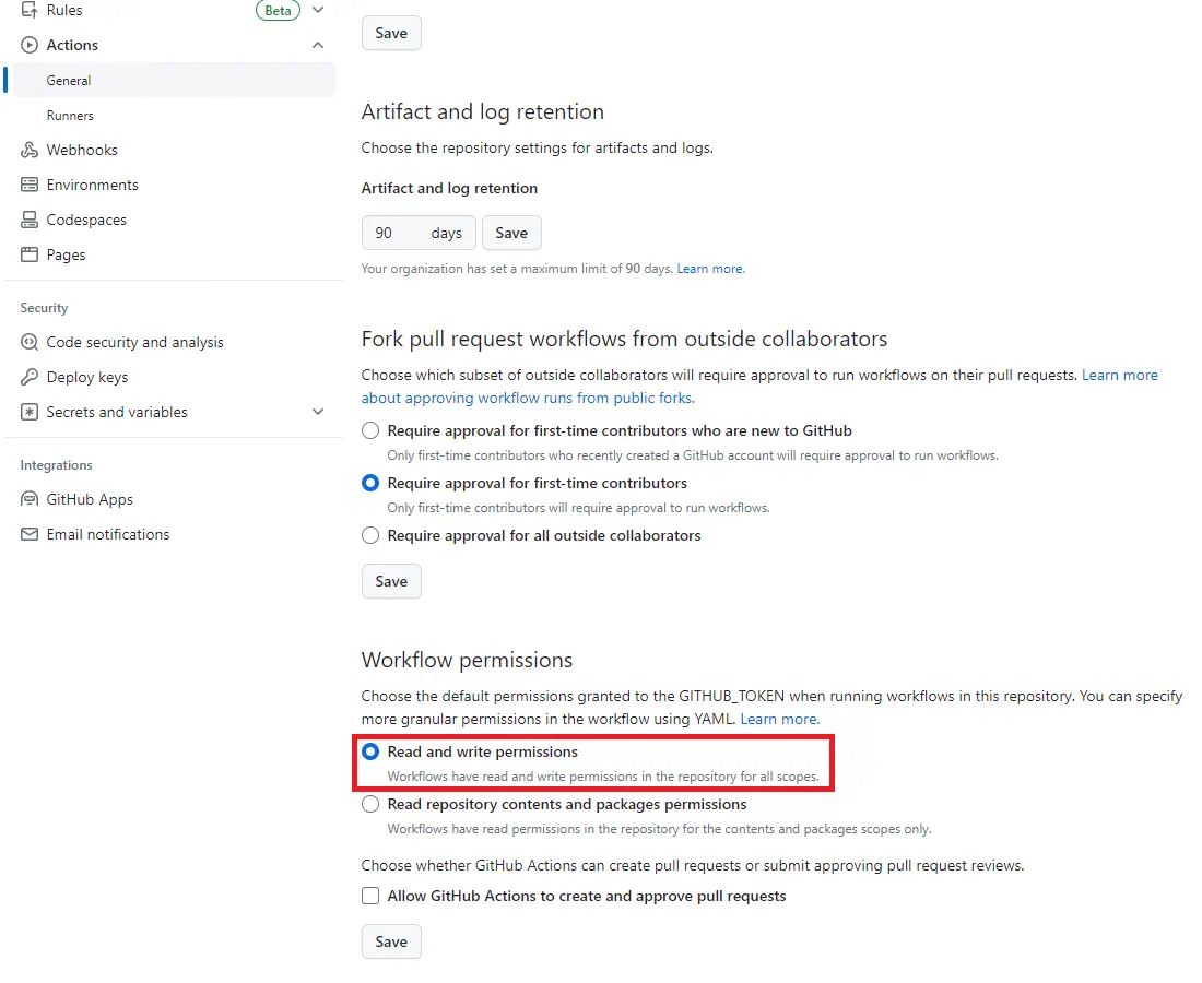 また、設定の「Actions」→「General」で「Workflow permissions」の設定が「Read and write permissions」になっているか確認しましょう。これが設定されていないとActionの書き込み権限が無いので上手く動作しません。
