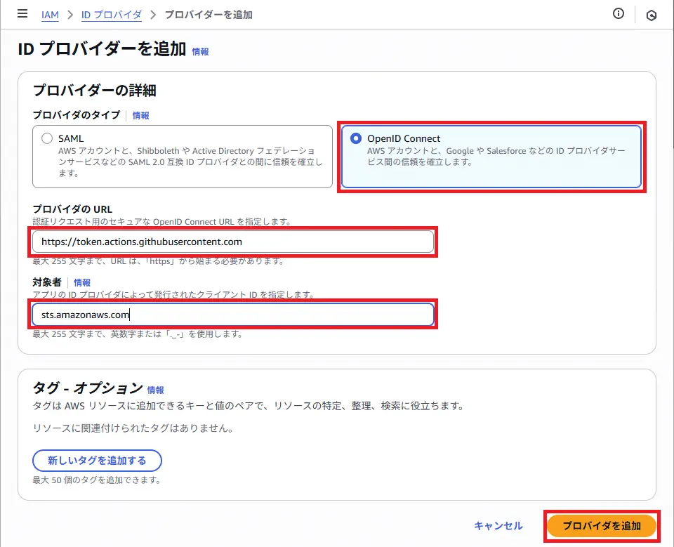 まずは、AWS IAMコンソールの「IDプロバイダ」から、OIDCプロバイダの設定を以下の様に行います。