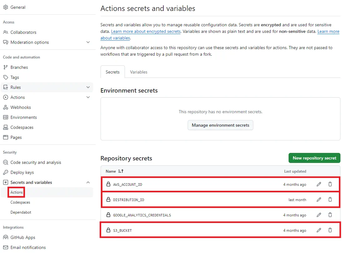 AWS_ACCOUNT_ID:AWSのアカウントIDS3_BUCKET:AWS S3のバケット名DISTRIBUTION_ID:Amazon CloudFrontのディストリビューションID