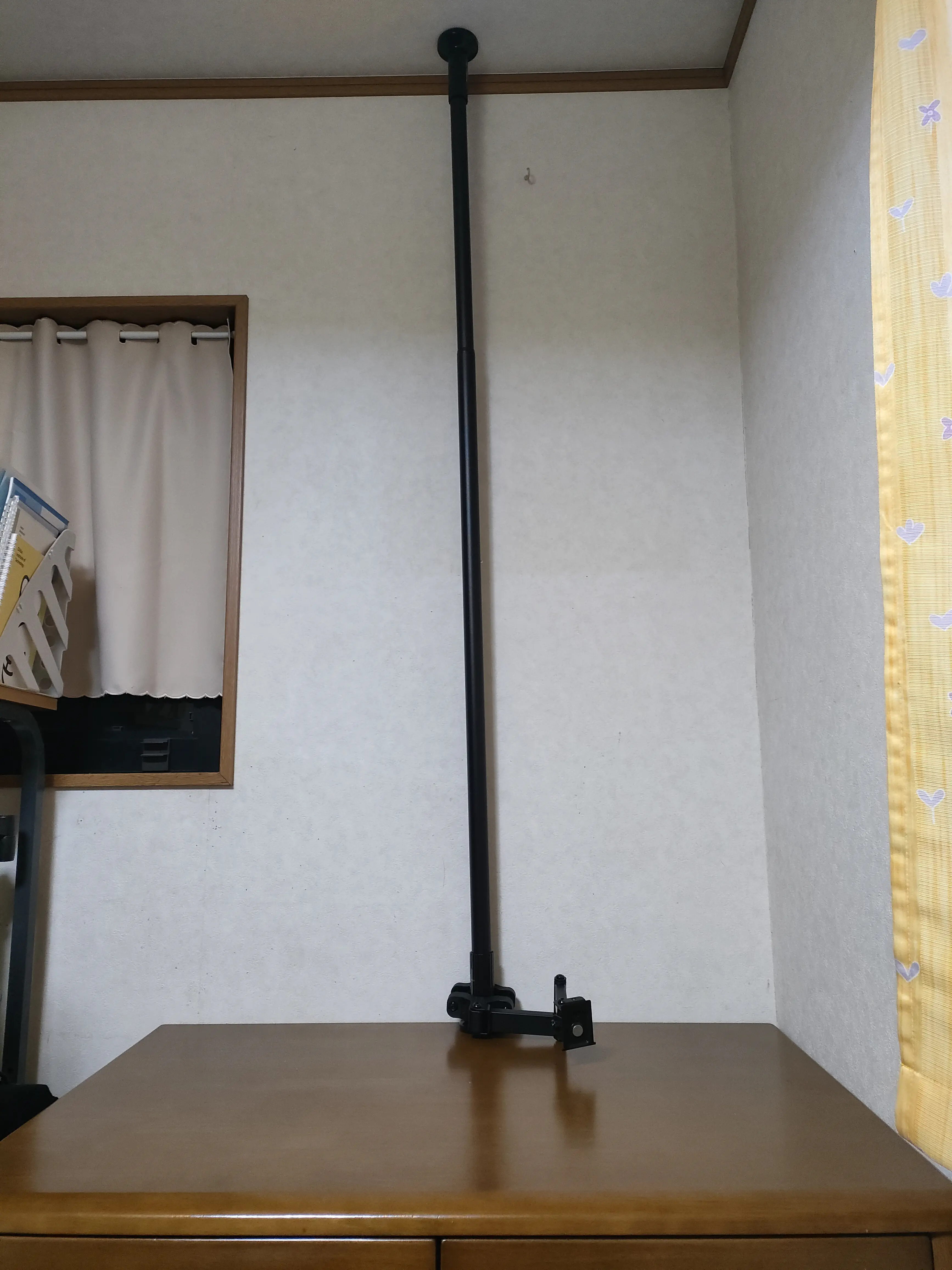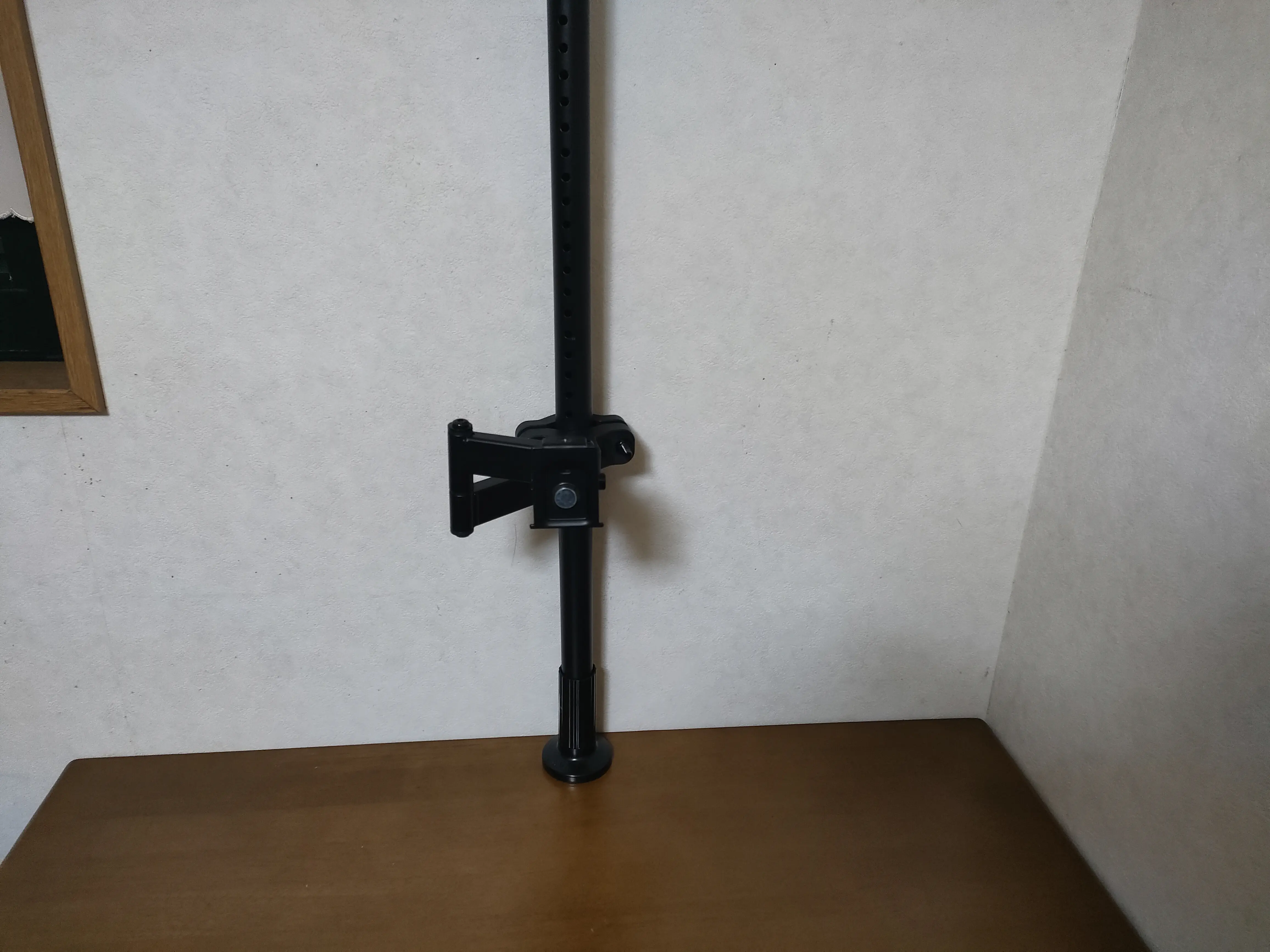 このモニターアームは直径28mm以上のポールに取り付け可能ですので、直径32mmの突っ張り棒を購入しました。取り付けの画像がこんな感じになります。突っ張り棒を設置する前に、モニターアームを棒に通しておかなければならないので注意。