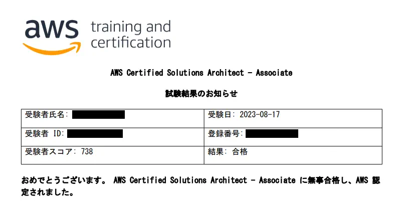 AWS Solutions Architect Associate(ソリューションアーキテクトアソシエイト)試験(SAA-C03)を2023年8月に受け合格しましたので、試験の対策・結果・感想などを合格体験記としてまとめたいと思います。
