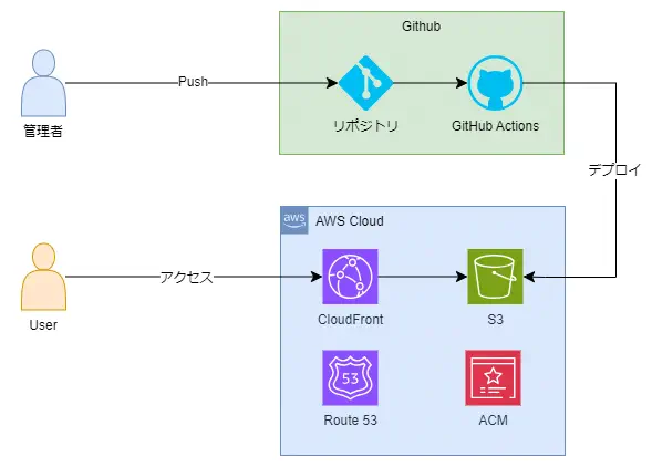 また、サイトのコンテンツはGit(Github)で管理しており、ブログ更新時のHugoのビルドとS3へのデプロイはGitHub ActionsによるCI/CDパイプラインを用いて自動的に行っています。